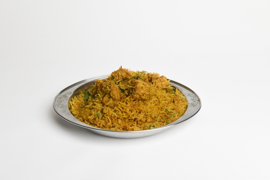 Riz basmati sauté avec poulet désossé, oignons, épices & garni de coriandre